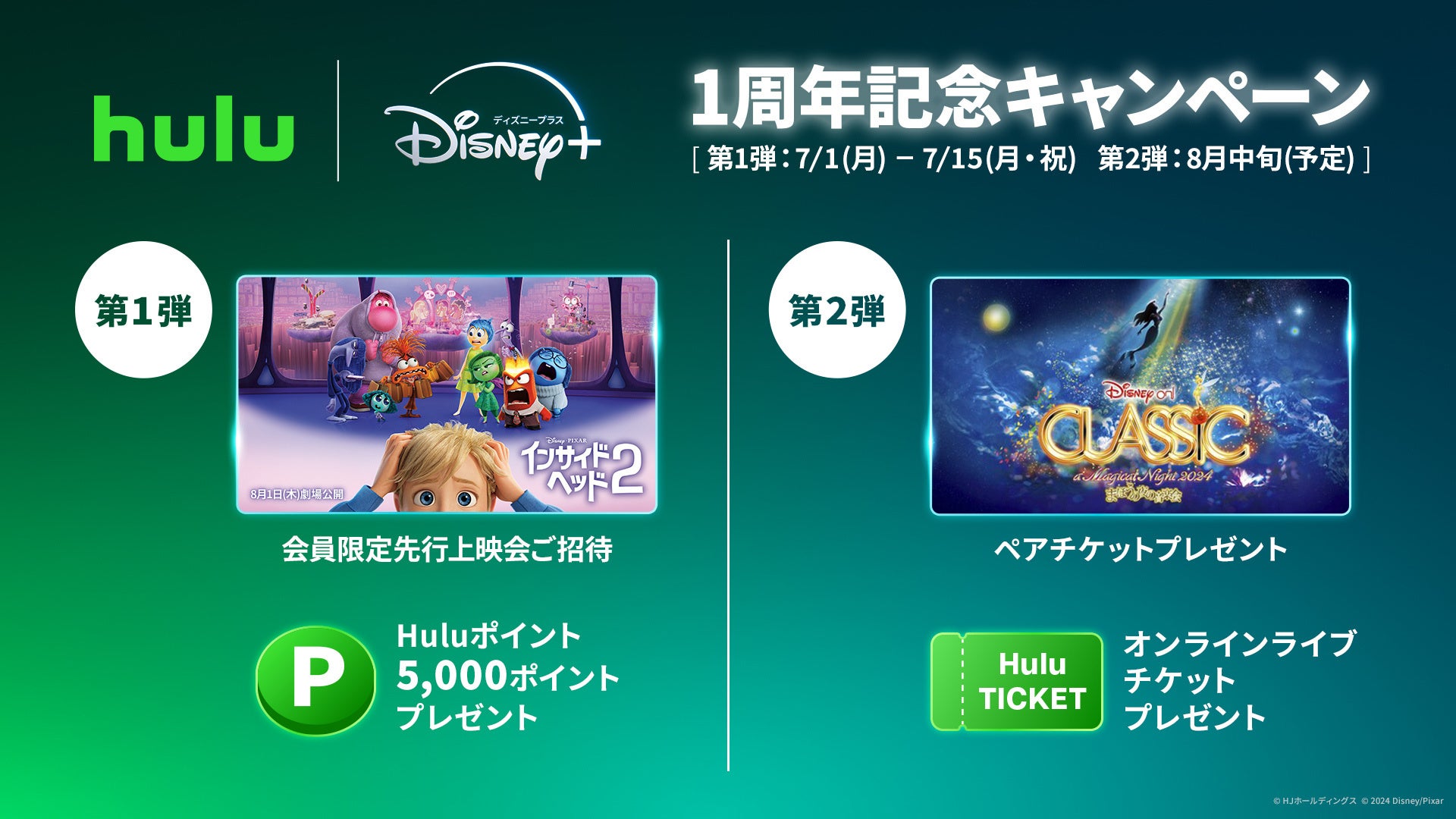 キャンペーン第1弾では、抽選で、Huluで更に作品を楽しめるレンタル/購入にご利用いただける5,000ポイント(3か月期間限定)*プレゼントや、8月1日劇場公開のディズニー&ピクサー最新作『インサイド・ヘッド2』(吹替版)のセットプラン会員限定の先行上映会へのご招待をお選びいただけます。