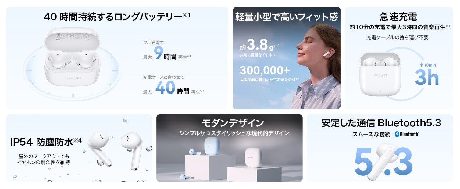 ※1 4000円~6000円までのTWSイヤホン市場において、2023年7月のファーウェイ自社調べに基づく。バッテリー駆動時間および充電データは、AAC形式の音声を50%の音量レベルで、その他の機能はデフォルトの設定を使用して再生した場合のファーウェイラボのテスト結果によるものです。充電ケースと合わせて最大40時間バッテリーが持続します。実際の結果は、音量、オーディオソース、環境干渉、製品機能、および使用習慣によって異なる場合があります。