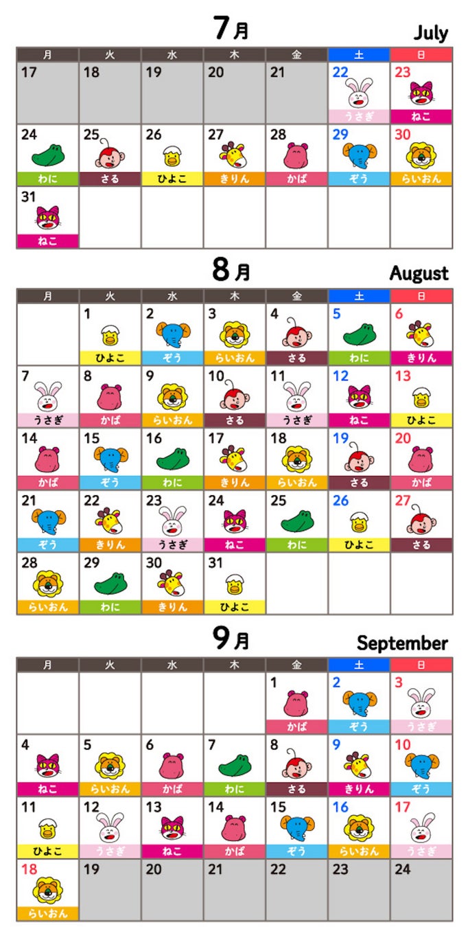 『たべっ子どうぶつLAND』の開催期間中、毎日異なるどうぶつさんが登場する「キャラクターグリーティング」の日替わりスケジュールを公開。カレンダーでお気に入りのどうぶつさんが登場する日にちをチェックし、入場予約にお役立てくださいませ。