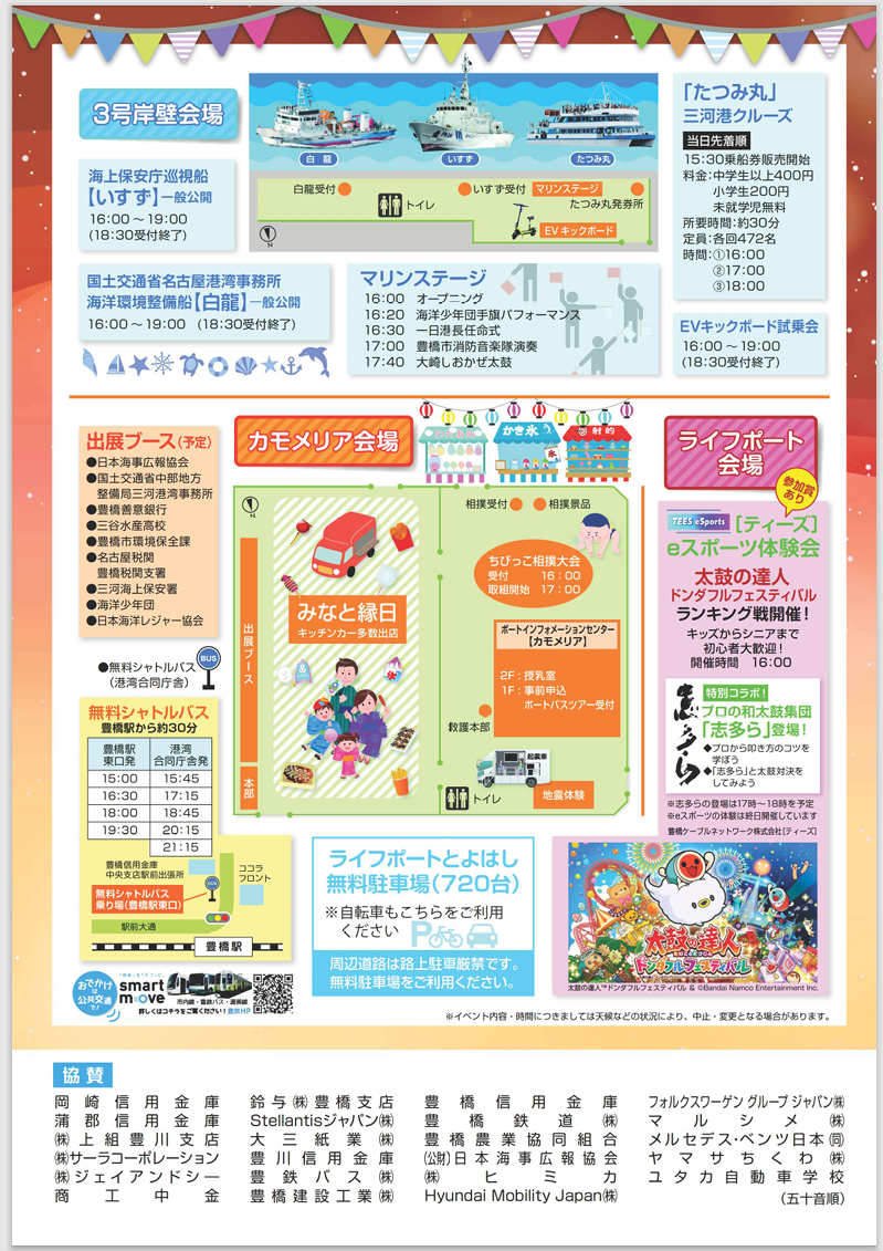 みなとフェスティバル会場には、豊橋駅東口(豊橋信用金庫中央支店駅前出張所付近)から無料のシャトルバスも運行、こちらも利用してください。