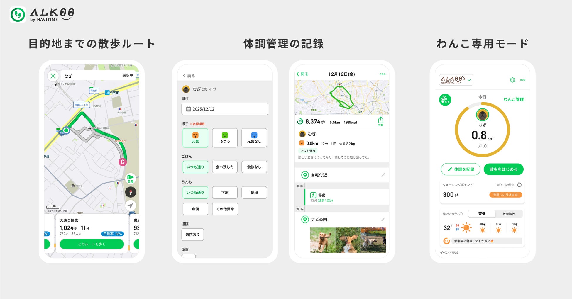 株式会社ナビタイムジャパン(代表取締役社長:大西 啓介、本社:東京都港区)は、2025年10月2日(木)より、ウォーキングアプリ『ALKOO by NAVITIME』にて、ペットとのお散歩機能「ALKOO withわんこ」モードを追加し、全ユーザー向けに開放いたします。さらに、「体調管理機能」や、「目的地までの散歩ルート」などの新機能も追加いたします。
