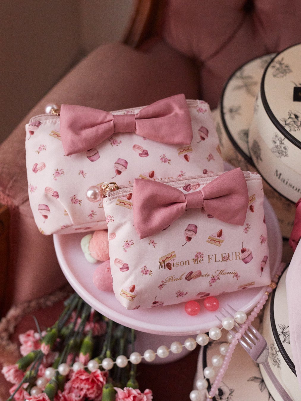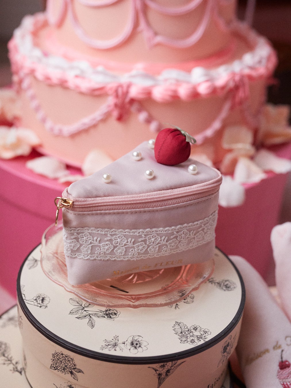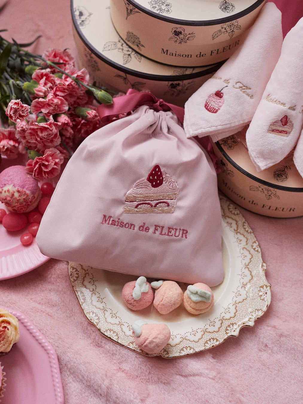 中でもおすすめは、とびきりキュートなトライアングル型のポーチです。まるで本物のショートケーキのようにイチゴを飾り、Maison de FLEURの特徴でもあるパールやレースでクリームを表現。目にも楽しいスウィーツを前にした時のように心がときめくアイテムに仕上げました。お出かけの際はもちろん、バレンタインに向けてお部屋を彩るアイテムとしてお楽しみいただくのもおすすめです。