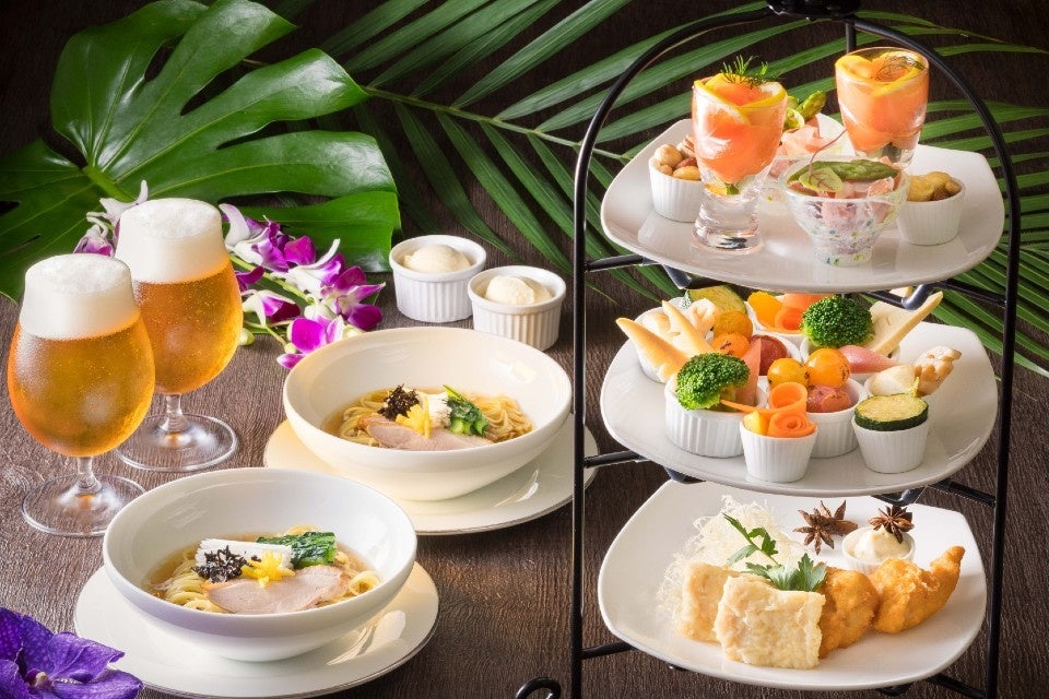 見た目にも華やかなスタンドでご提供する“Jo-jiスタンド”には、ラウンジ&ダイニングSORAEで人気のベジタブルマリネや、ジューシーな味わいが広がるチキンのベニエなど、お酒のお供にぴったりの料理が並びます。さらに、あっさり醤油ベースの締めのヌードルと、デザートも付いたボリューム感のある内容です。