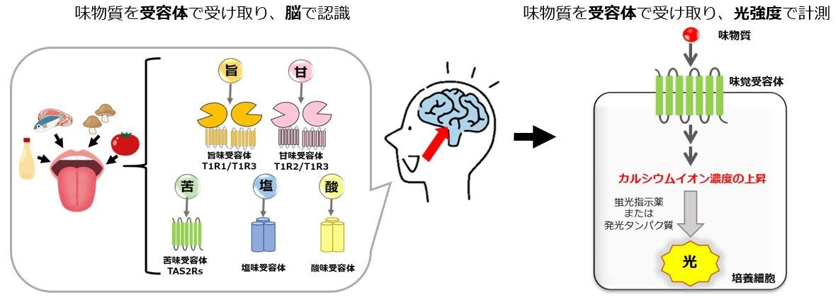 人の舌には、5つの基本味(甘味、うま味、苦味、酸味、塩味)に対応する5種類の「味細胞」が存在し、その表面には「味覚受容体」があります。味覚受容体が味物質を受け取り、味覚神経を介して情報を脳に伝達することで、人は味を認識しています。甘味やうま味を受け取る受容体はそれぞれ1種類であるのに対し、苦味の受容体は25種類も存在することが知られています。しかしながら、ピーマンの主要な苦味成分「クエルシトリン」を、どの受容体が受け取ることで苦味を感じているのか、詳しいメカニズムは分かっていません。また、人が食物から感じることができる苦味の強度は非常に弱く、高い感度を持つ測定法が求められます。