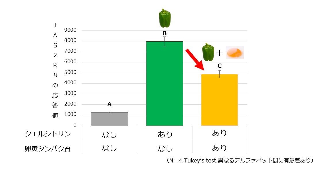 25種類のうち複数の苦味受容体でクエルシトリンを受容することが確認できました。中でも苦味受容体「TAS2R8」は活性化の程度が大きく、ピーマンの苦味の認識に最も寄与していることが分かりました。さらに、クエルシトリンと一緒に卵黄タンパク質を投与することで「TAS2R8」の応答強度が下がることを確認し、卵黄タンパク質がピーマンの苦味を抑制する可能性が示唆されました。