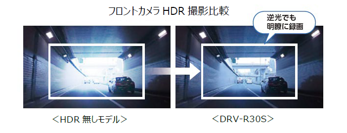 1. HDR機能を搭載、トンネルの出入り口など明暗差の激しいシーンで安定した録画が可能