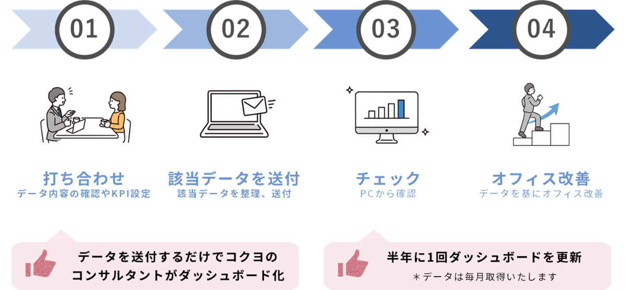 ・上記内容以外にダッシュボードを導入するための打合せとダッシュボード作成費用がかかります。