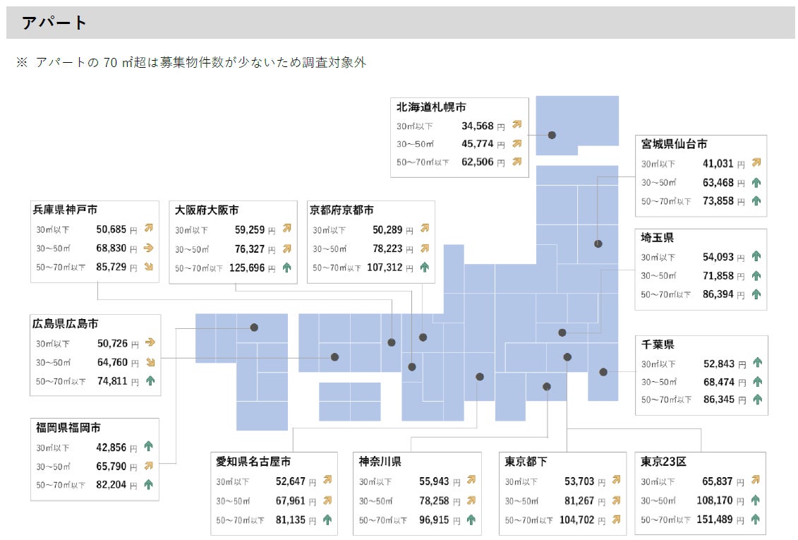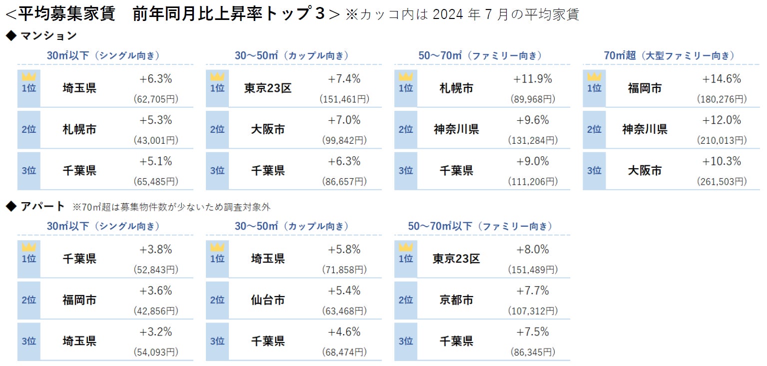 <2024年7月 全国主要都市における賃貸マンション・アパートの平均家賃(面積帯別)>