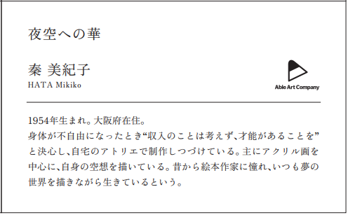 エイブルアート・カンパニーと契約している作家(以下「登録アーティスト」)は、自らの表現の可能性をひらいていきたいと思う人たちの中から、全国公募により選考されています。