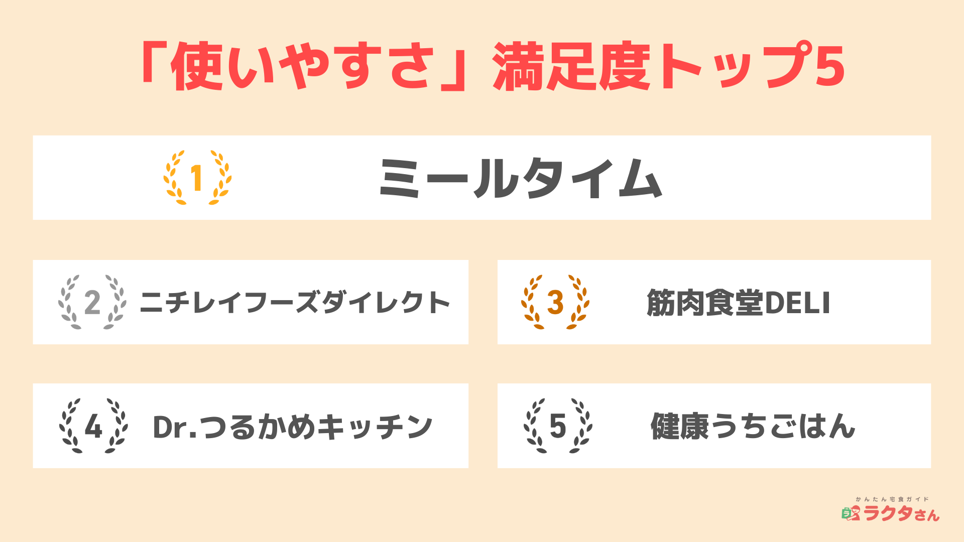 使いやすさ満足度1位には、管理栄養士が監修した食事で、メタボや腎臓病などの改善を目指すことができる「ミールタイム」が選ばれました。