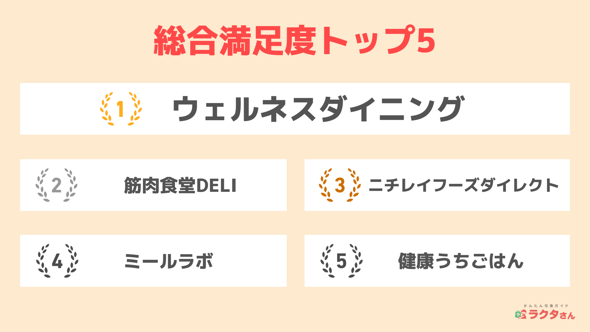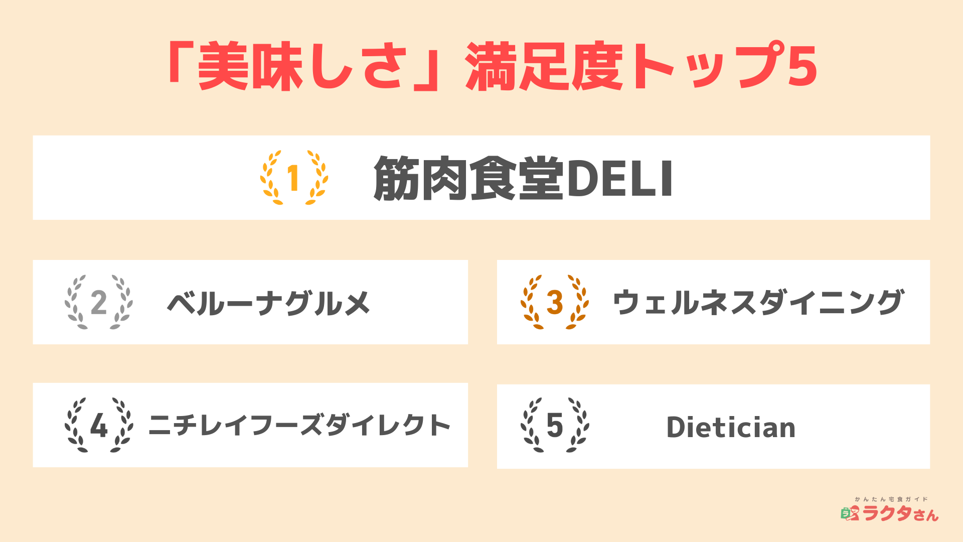 味の満足度では、高タンパク・低糖質・低カロリーかつ、レストランのような美味しい食事を定期便でお届けする「筋肉食堂DELI」が1位にランクインしています。