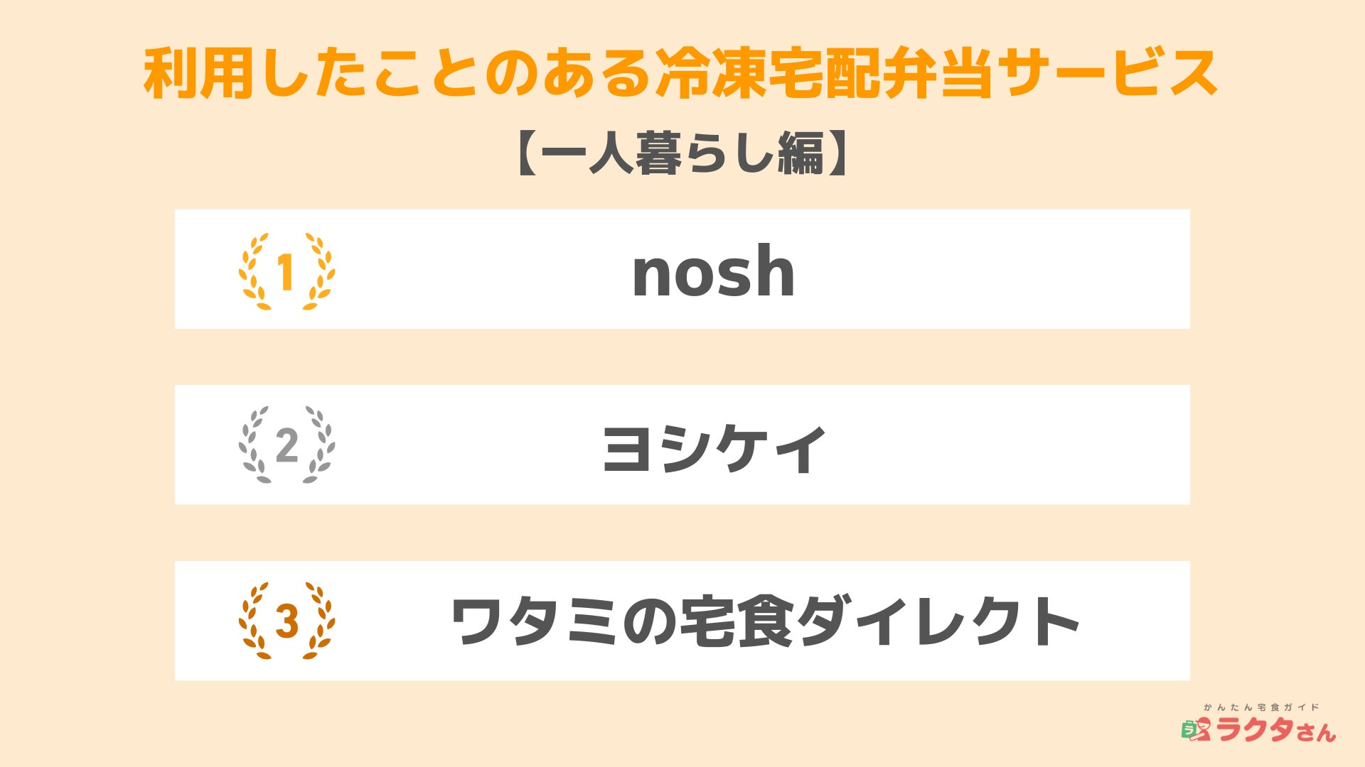 これから春を迎え、進学や就職など新たな環境で生活を始める人が多い時期にあわせ、一人暮らしの利用経験サービスを調査した結果、1位「nosh(97人)」、2位「ヨシケイ(65人)」、3位「ワタミの宅食ダイレクト(63人)」となりました。