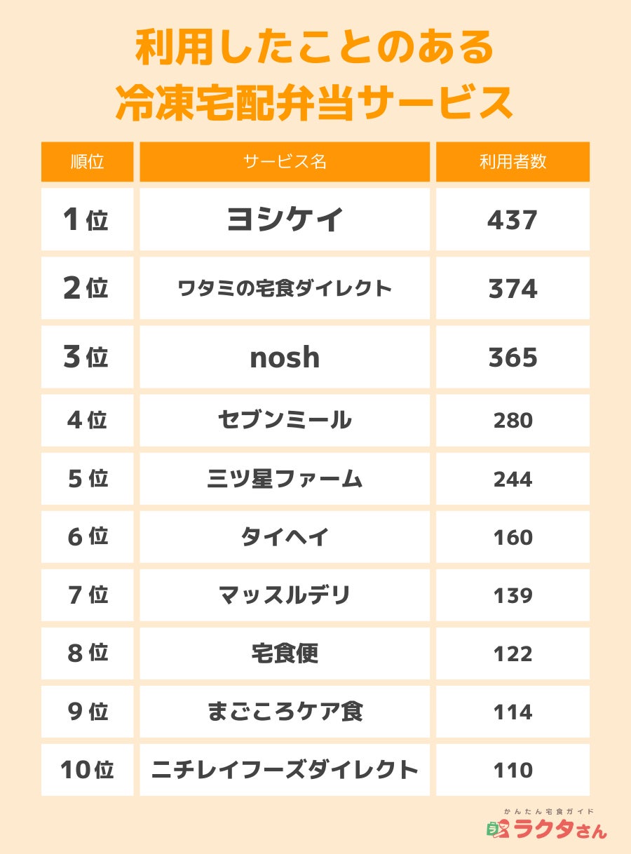 冷凍宅配弁当を利用している・利用したことがあると回答した1,243人に、利用経験のあるサービスを調査した結果、1位はヨシケイ開発株式会社が運営する「ヨシケイ」、2位はワタミ株式会社の「ワタミの宅食ダイレクト」、3位はナッシュ株式会社が運営する「nosh(ナッシュ)」でした。
