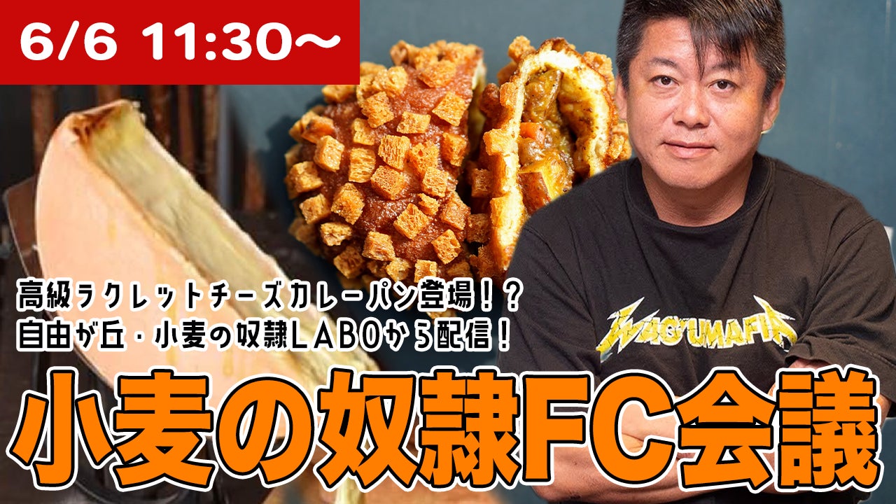 6月6日(月)に、YouTube【ホリエモンチャンネル】にて「小麦の奴隷FC会議」をライブ配信します。今回も、移転リニューアルした新店舗「小麦の奴隷LABO 自由が丘」よりお届けします。