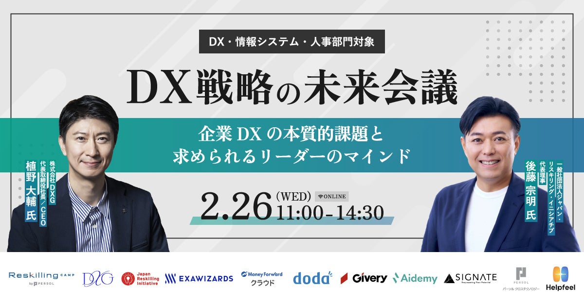 「はたらいて、笑おう。」をビジョンに掲げるパーソルグループのパーソルイノベーション株式会社 Reskilling Camp Company(本社:東京都港区、Reskilling Camp Company代表:柿内 秀賢)が展開する、リスキリング支援サービス『Reskilling Camp(リスキリング キャンプ)』( https://www.reskillingcamp.jp/ )は、2月26日(水)11:00~14:30に、DX推進を目指す企業のためのカンファレンス「DX戦略の未来会議」を開催します。全10社1団体が集結し、業界トップの12名が、企業DXの本質的課題と求められるリーダー像について語ります。