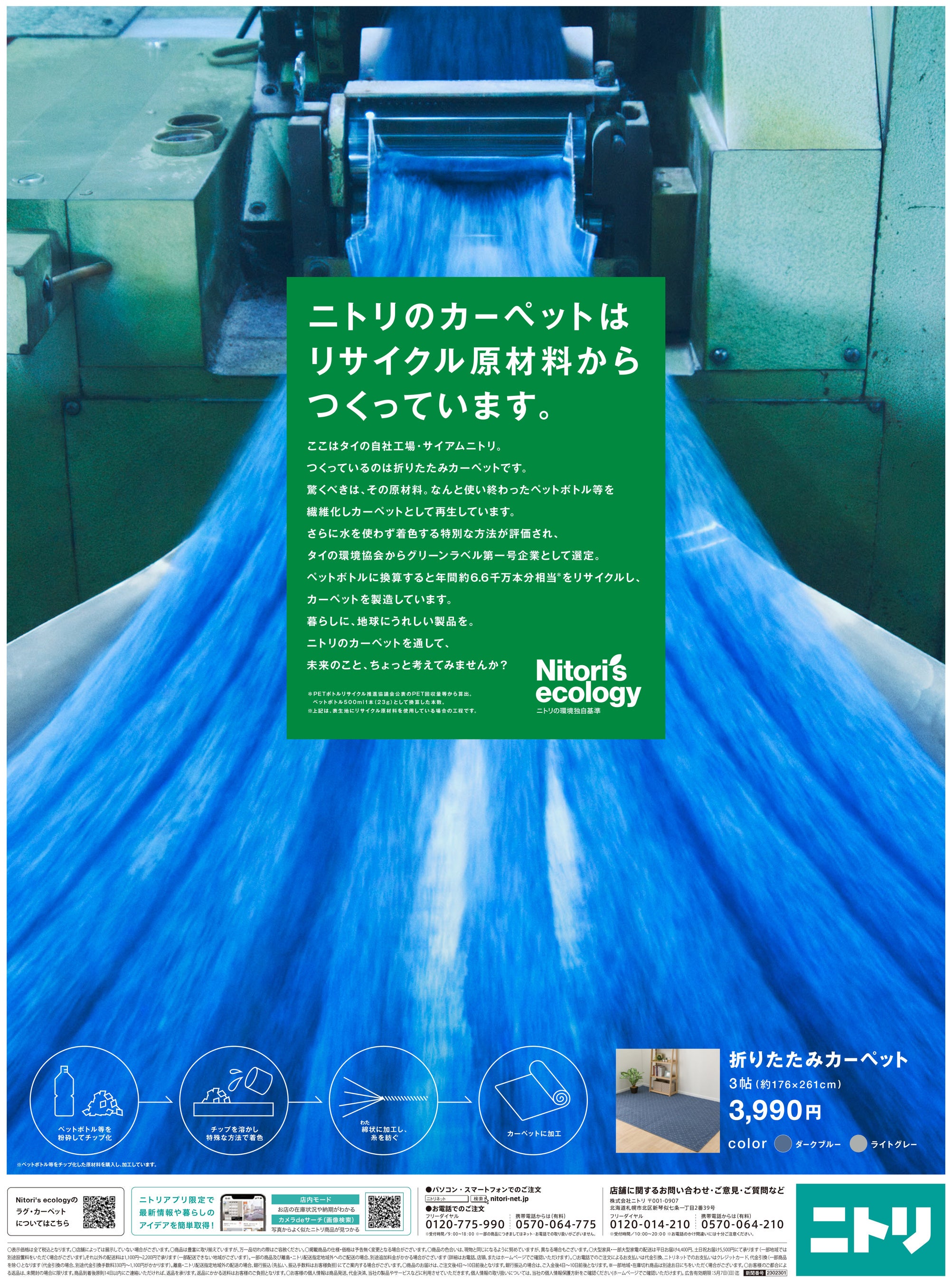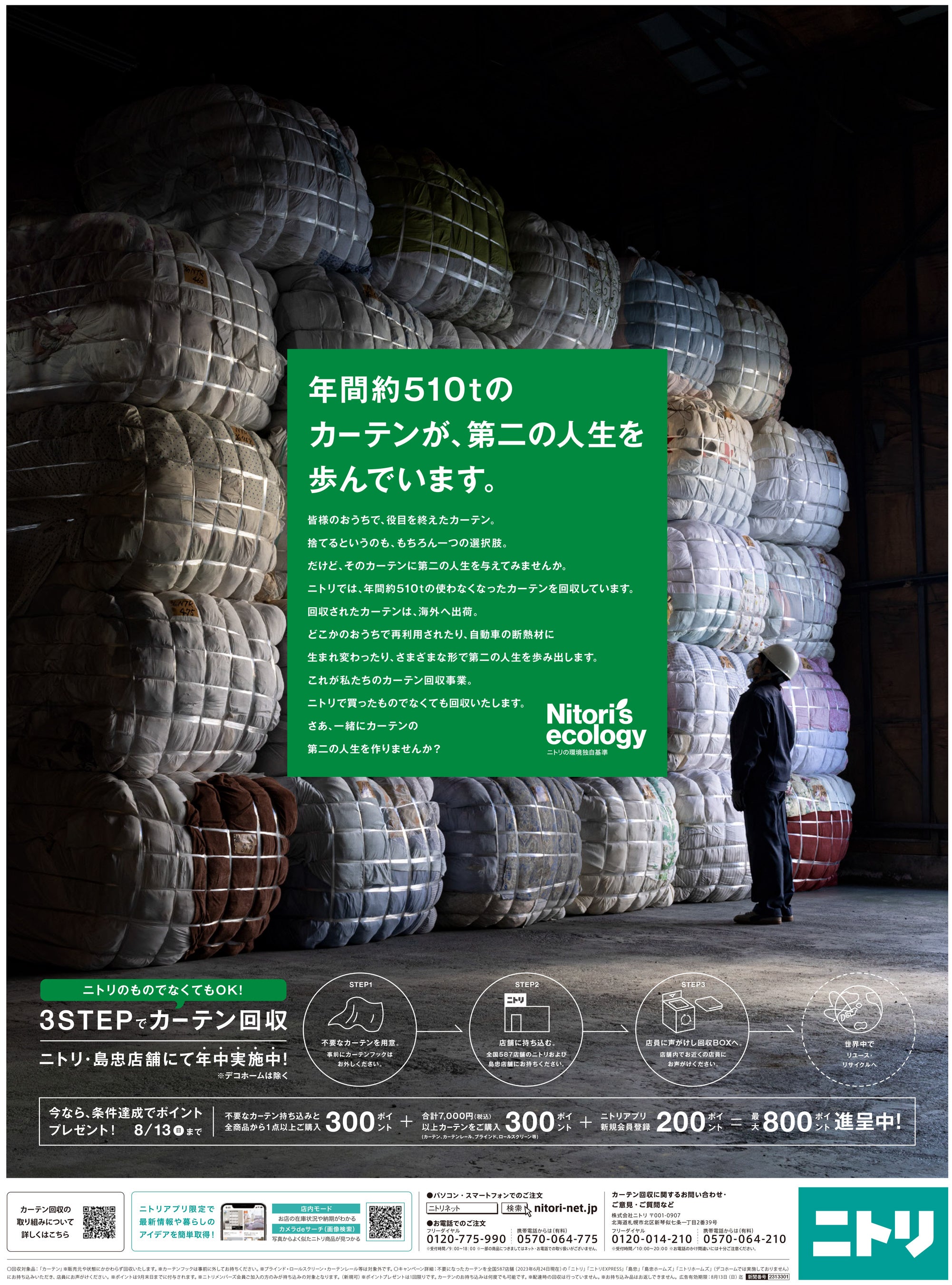 これらの取り組みを多くの方々に知っていただくことを目的として、2022年よりシリーズ広告を掲載。今年度は、より臨場感をもってお伝えすることを目指し「ニトリのサステナブルな現場」をテーマに作成しました。「リサイクル原材料を使用したカーペット製造」では、タイの自社工場サイアムニトリの製造現場を、「カーテンのリサイクル回収の取り組み」では、お客様から回収したカーテンの集約現場を撮影・掲載しました。