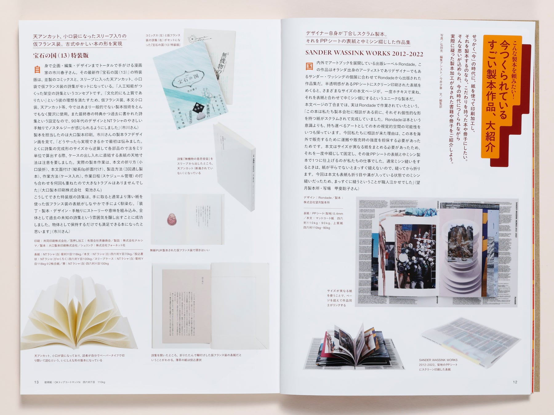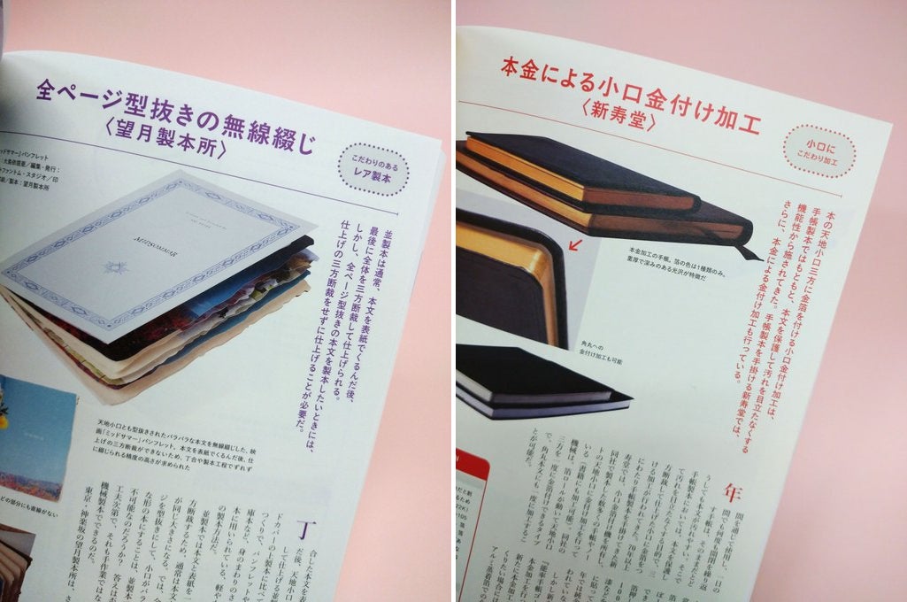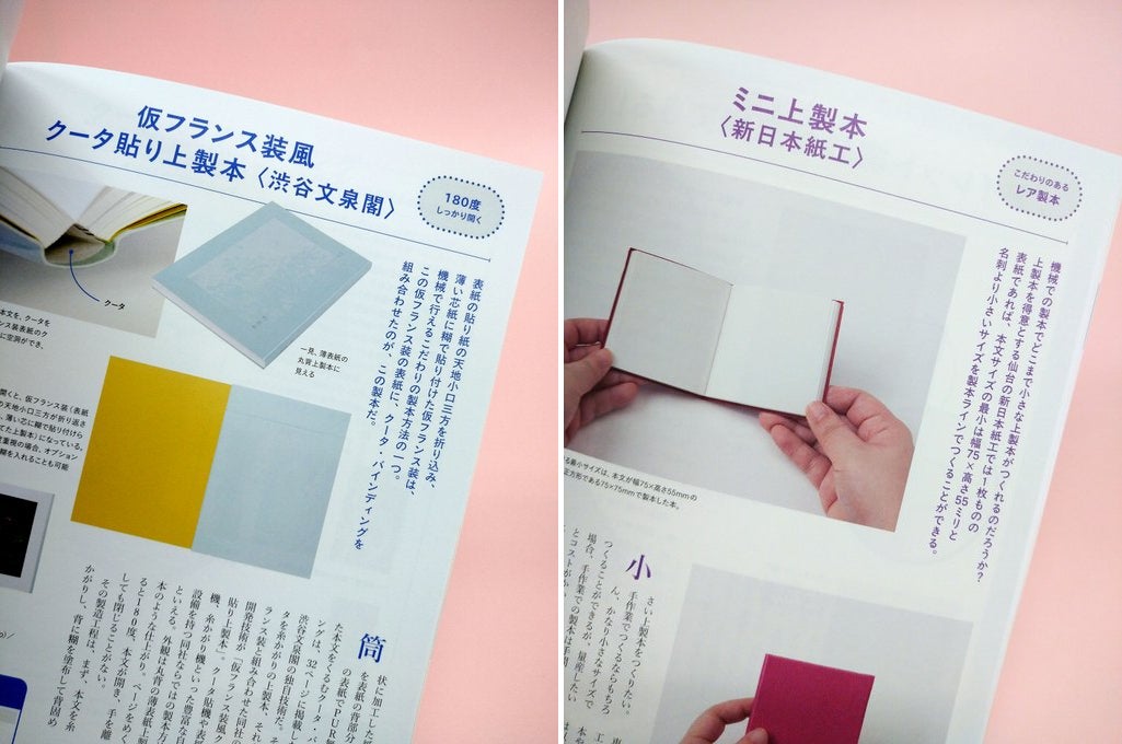 出版社が出す書籍はもちろん、個人的に作品集などの冊子をつくる人、自社ブランドでノートや手帳など「使う冊子」をつくりたいひとなど、こだわった本づくりをしたいというひとにむけて、現在日本でできる製本を数多く紹介する特集を掲載。