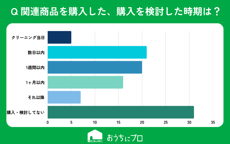 エアコンクリーニングの関連商品を購入した時期は作業から「数日以内」から「1ヶ月以内」に集中している。