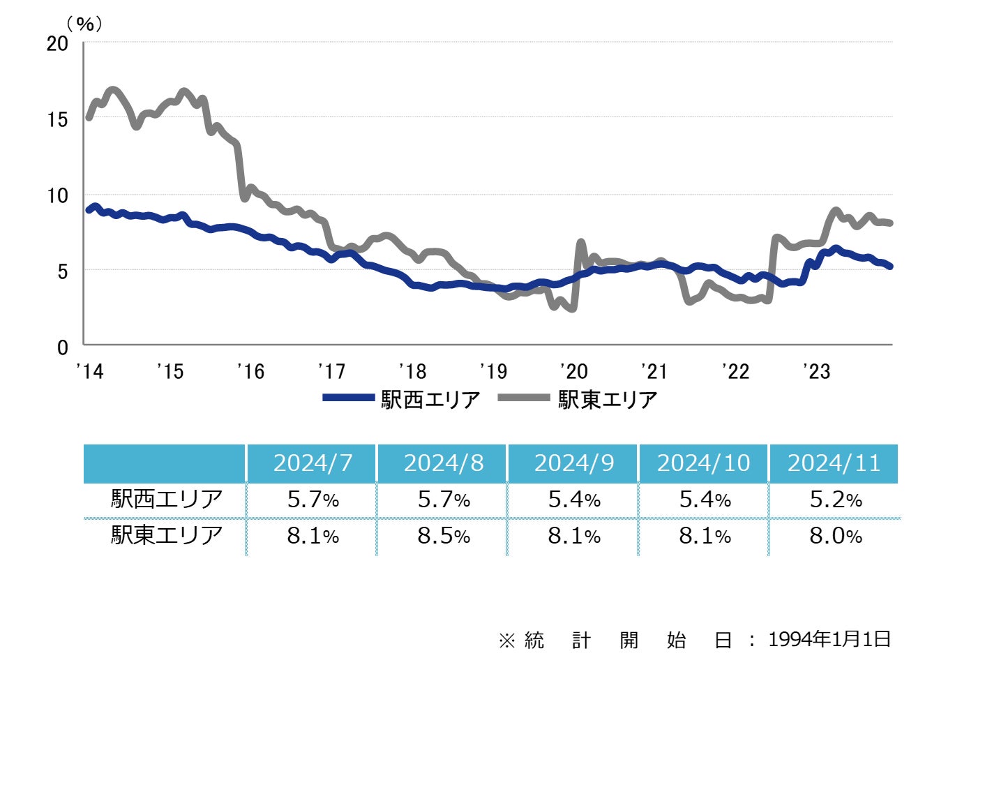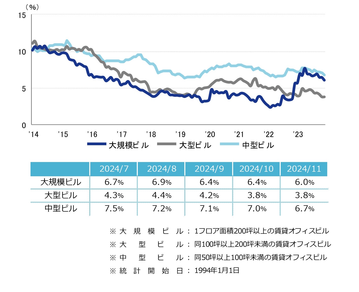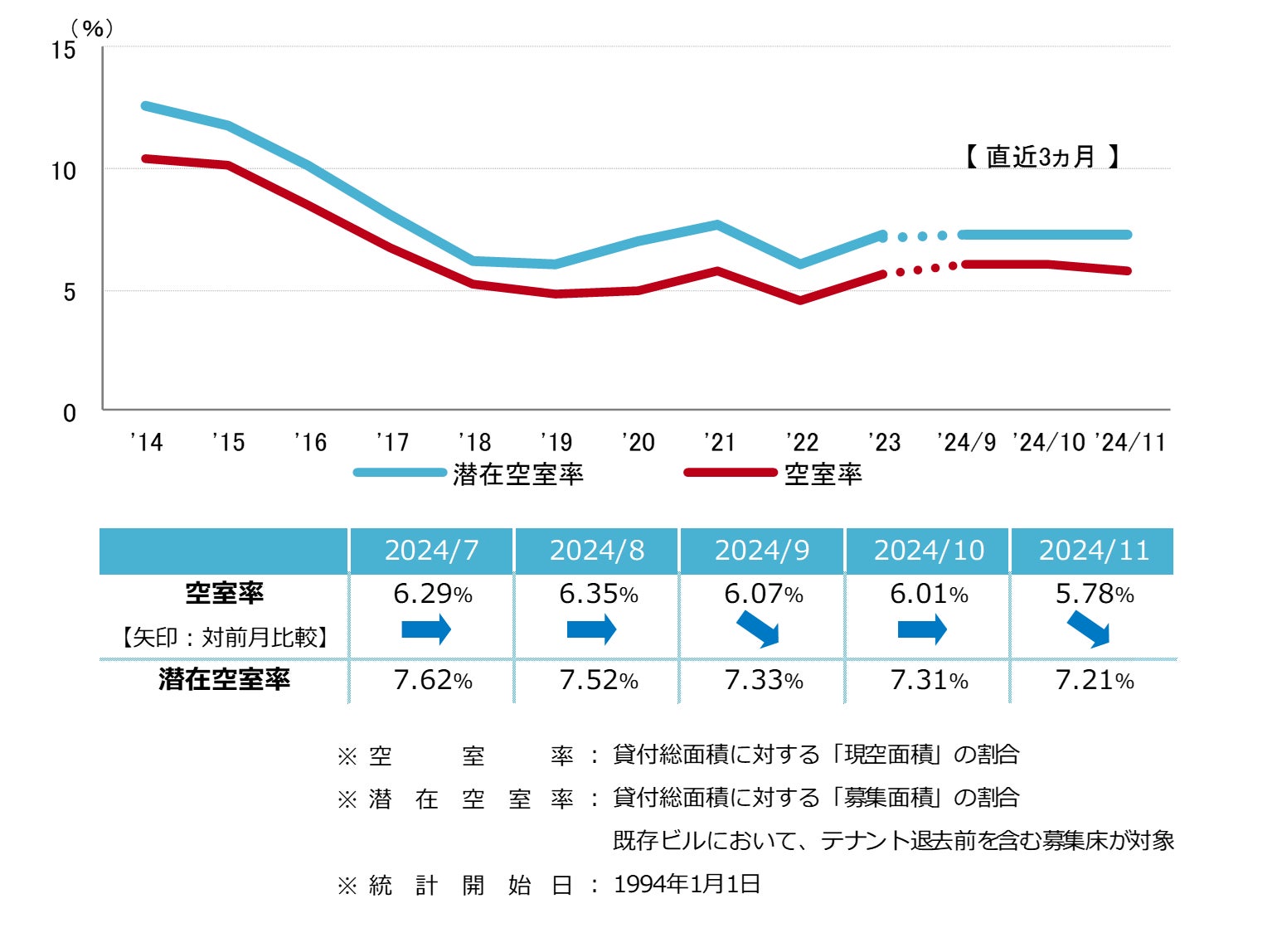 空室率は前月比マイナス0.23ポイントの5.78%と3ヵ月連続で低下し、2023年12月以来の5%台となった。主要エリアの大規模ビルを中心に、建替えに伴う移転や館内増床等で空室床の消化が進み、主な低下要因となっている。潜在空室率は前月比マイナス0.10ポイントの7.21%だった。