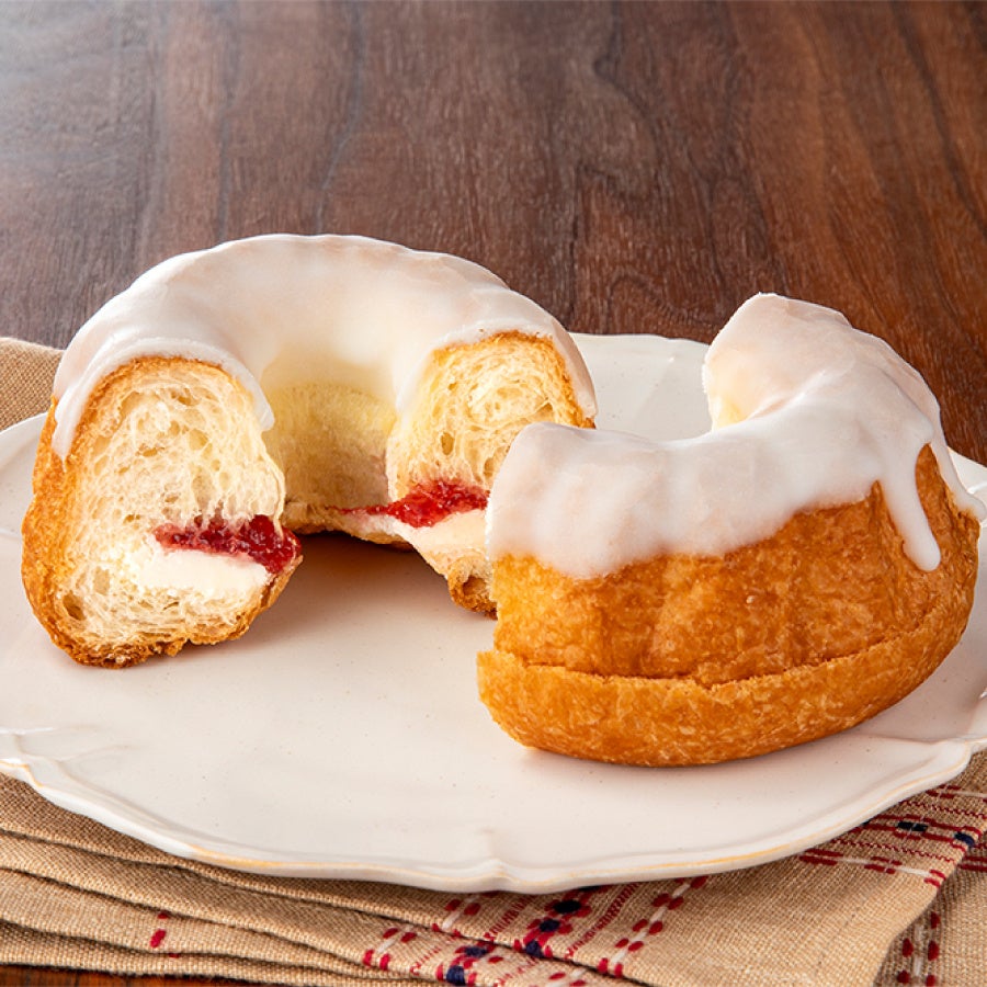 紅ほっぺ苺を使用した苺ジャムとホイップクリームをサンドしたデニッシュパンです。歯切れが良く、サクっとした食感のデニッシュ生地に仕上げております。