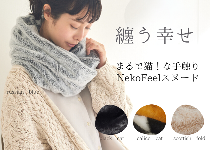 「外でも家でも癒されたい」という要望にお応えして商品化した着られるタイプの「猫フィール」。スポッと被れるベーシックなデザインで、首回り68cm。オフィスや車内、自宅でも着用しても邪魔にならなくて、「猫フィール」の生地独特のボリュームを感じられる大きさです。