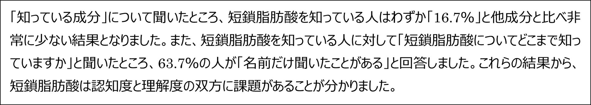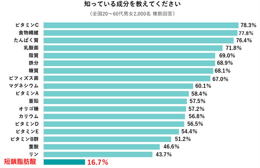 ・短鎖脂肪酸の認知度は「16.7%」と他成分と比べ最も低い結果に