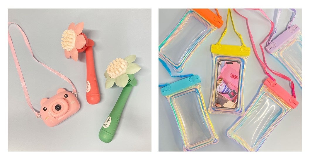 また、水遊び時の必需品である「防滴スマホケース」は、オーロラのように輝くクリア素材に選べる5色のビビットカラーのストラップが目立つ、デザイン性にこだわった商品です。