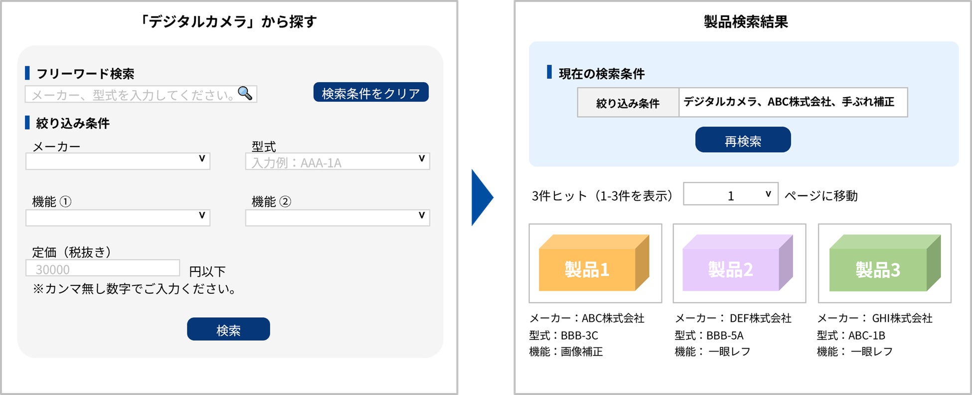 一方、「絞り込み検索型」は複数の条件(カテゴリ、機能、価格など)の中から絞り込んで検索できる機能で、細かな条件指定ができるため、ユーザーが具体的な目的をもって検索を行う部品・機械などのサイトに適しています。