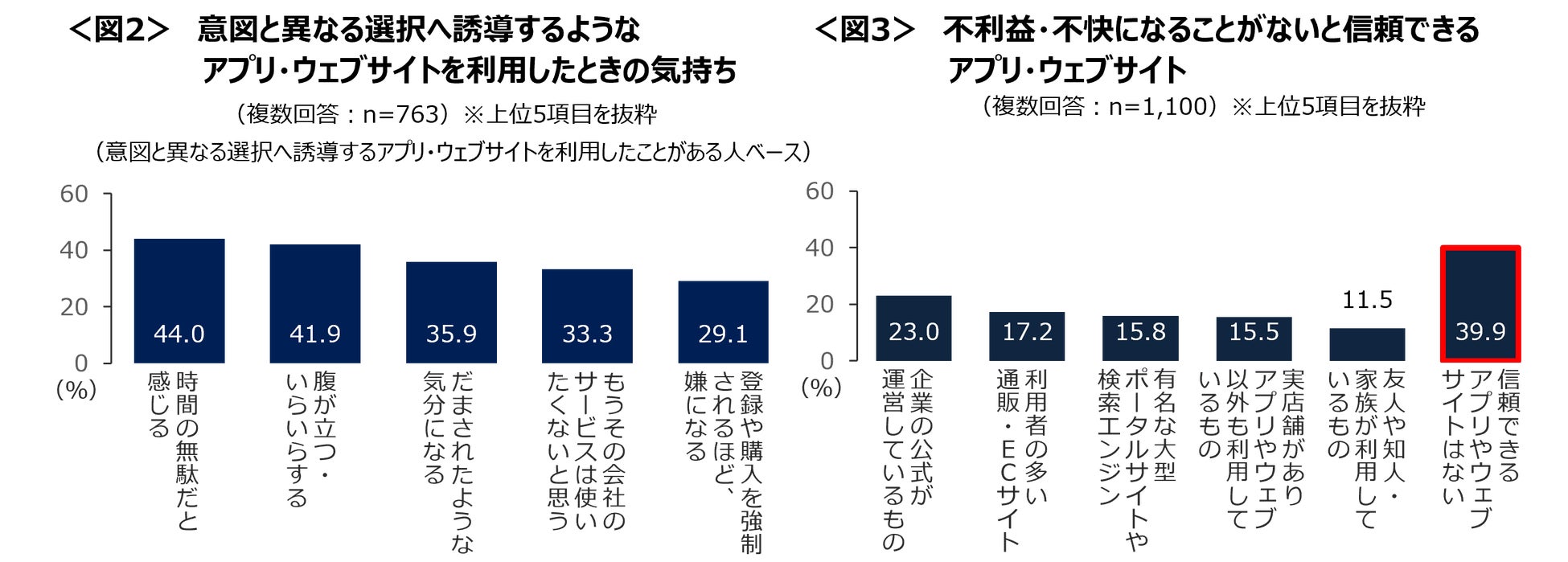 ダークパターンのアプリ・ウェブサイトに接触したときの気持ちは、「時間の無駄」や「腹が立つ・いらいらする」と感じる人が4割程度。約3人に1人は「もうその会社のサービスは使いたくないと思う」と回答しており、サイトを運営する企業・サービスのイメージダウンや離反も招いている様子。<図2>
