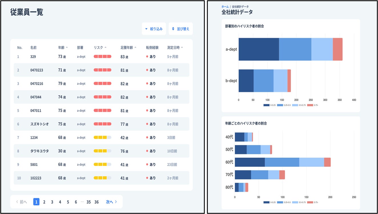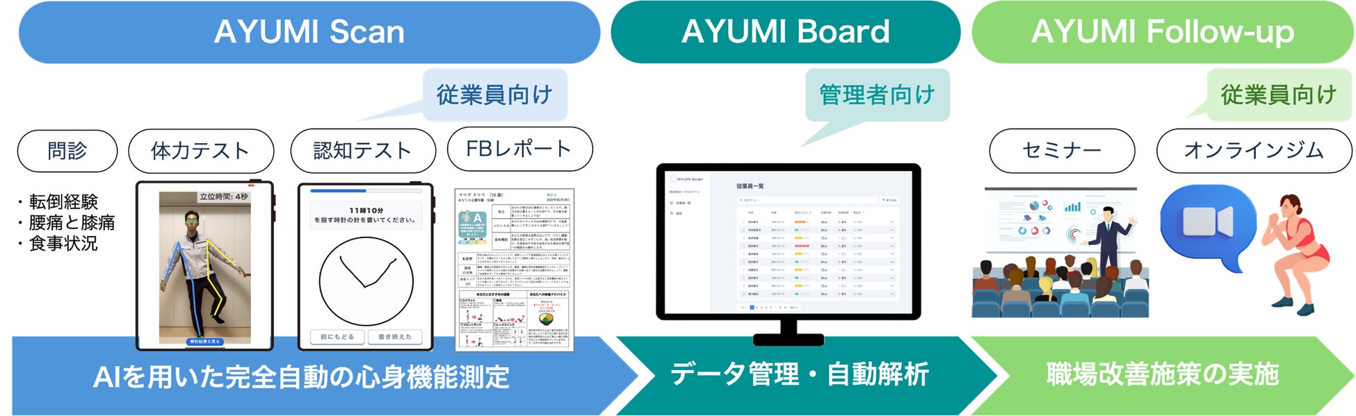 AYUMI BIONICSが開発した、心身機能の状態を把握する測定アプリ「AYUMI Scan」は、スマートフォンやタブレット端末のカメラ機能を用いて、足腰筋力・バランス力・柔軟性・認知機能など、複数項目の測定が5分程度で可能です。測定結果は、ダッシュボード機能を備える「AYUMI Board」にリアルタイムに反映され、部署ごとの特徴や一人ひとりの経時変化を確認し、結果に応じた個別サポートを可能とします。