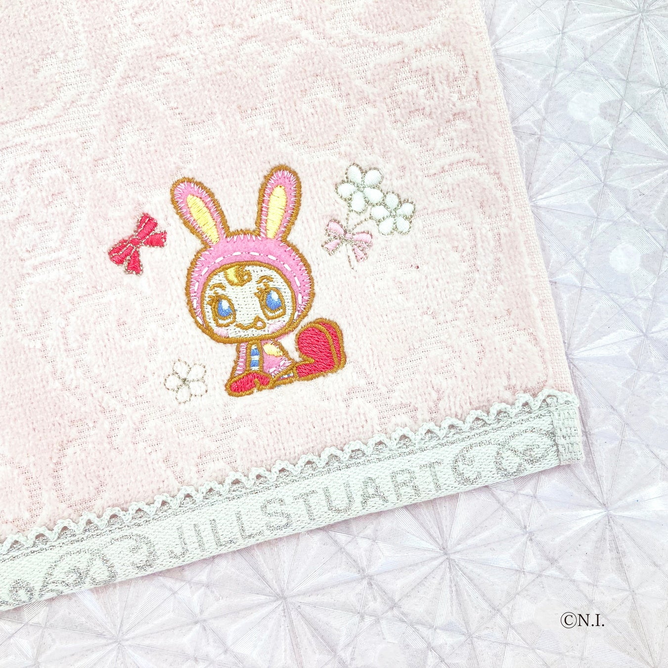 コーナーにべリエちゃんのアップリケ刺繍を施しました。ジルスチュアートのロゴのラメ糸もアクセント。
