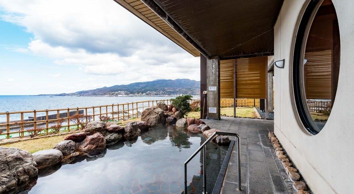 展望露天温泉は、雄大な日本海に浸っているような感覚に。サウナも女湯・男湯ともに備えています。