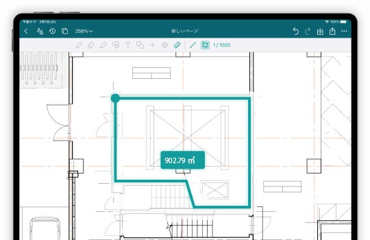 尺度を設定することで、図面上の対象物を実際の距離や面積に換算して表示できる機能。