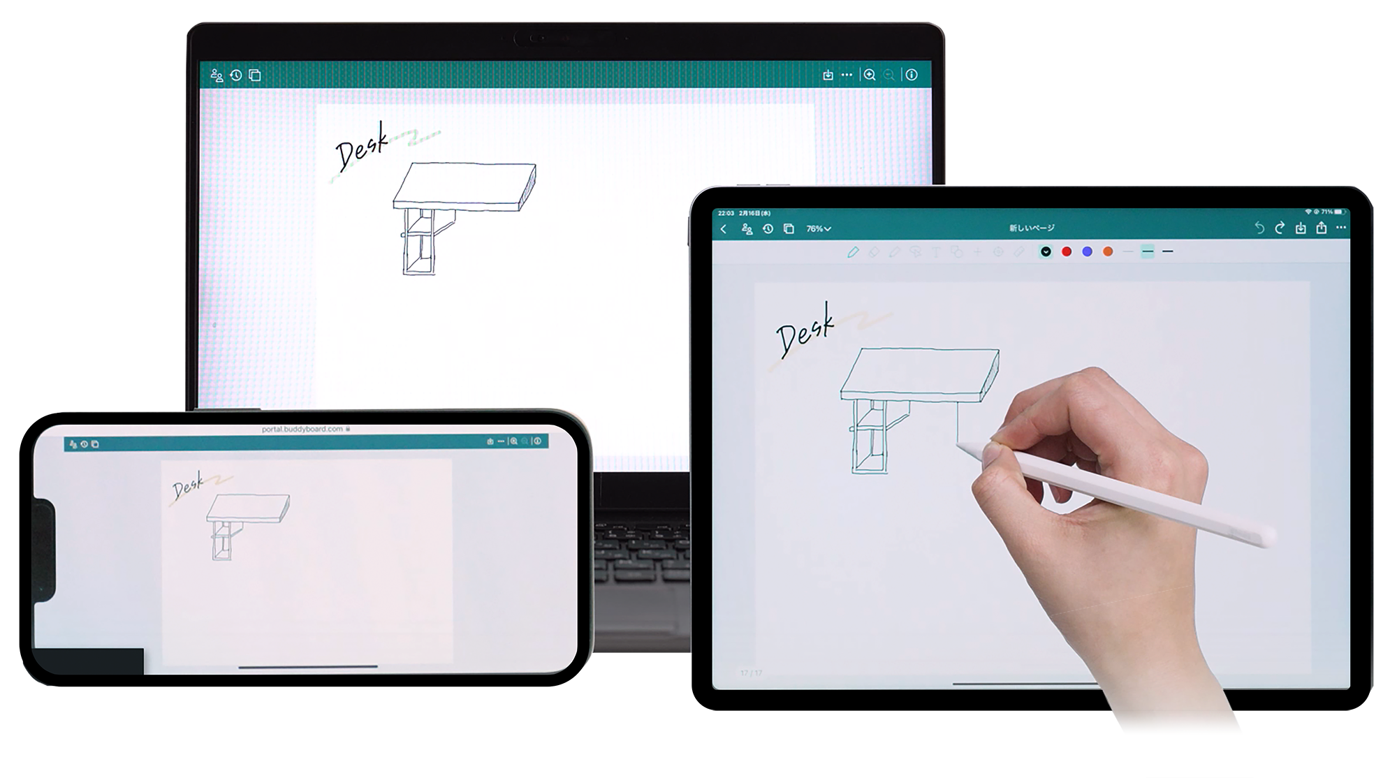 BuddyBoardユーザー同士なら、同じページへ同時に手書き入力することも可能。書き込んだ内容が遅延なく共有先の画面に反映されるため、遠隔地や複数人での同時編集もストレスなく行える。