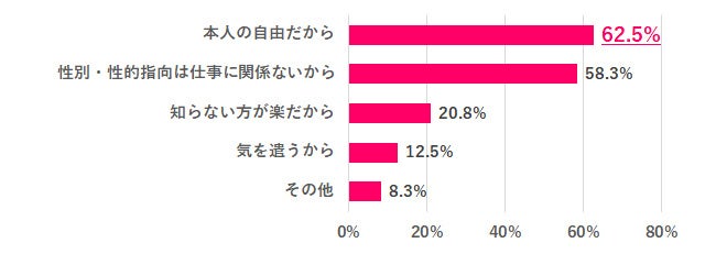 Q.4で、仕事で関わる人にLGBTQ+の人がいた場合「教えてほしくない」と回答した人にその理由を尋ねると、1位は「本人の自由だから」62.5%、2位は「性別・性的指向は仕事に関係ないから」58.3%となりました。