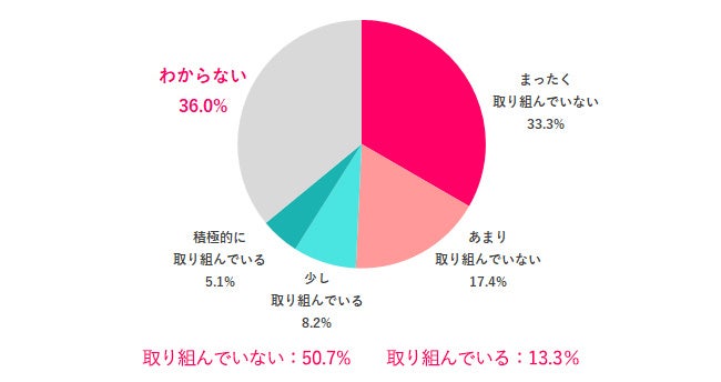 女の転職type会員に、職場でLGBTQ+※の人が働きやすい環境づくりに取り組んでいるか尋ねたところ、「わからない」36.0%が最も多く、次いで「まったく取り組んでいない」33.3%でした。「少し取り組んでいる」、「積極的に取り組んでいる」はそれぞれ8.2%、5.1%となり、環境づくりに取り組んでいる職場は全体の13.3%という結果でした。