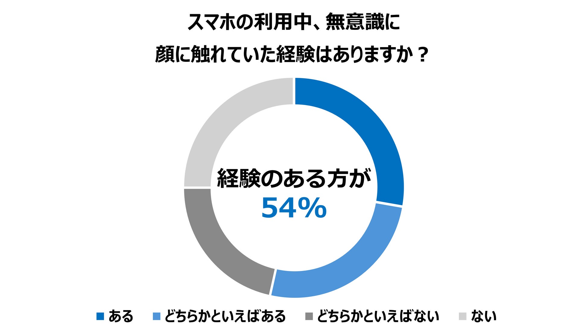 毛穴汚れの原因は一般的に皮脂の過剰分泌や角質の蓄積など、様々な要因があります。今回の調査結果では、比較的若い人が特に毛穴に悩んでいることがわかりました。前述の要因に加えて、若い世代が毛穴汚れで悩んでいる現代社会特有の原因として「スマホ」が考えられます。スマホの画面についた汚れが指に付着し、無意識に顔に触れてしまうことで汚れを肌に付けてしまっている可能性があると言えるでしょう実際に無意識に顔に触れていると回答した人は54%と半数以上の人がスマホ利用中に汚れを肌に付けてしまっている可能性があることがわかりました。