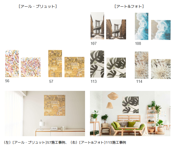 今回は、障害のあるアーティストの作品を用いた[アール・ブリュット]に2デザインを追加したほか、[アート&フォト]に風景画や人気の植物柄など4デザイン追加し、ラインアップを拡充しました。今後も魅力的な空間を演出するデザインを取り揃え豊かで快適な住まいの実現に貢献します。