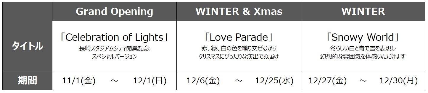 レーザーライトを駆使し、長崎の歴史的遺産と未来への希望を表現いたします。また、冬のクリスマスや1日限りのカウントダウンなど四季折々に多彩な演出を予定しております。長崎スタジアムシティならではの特別な体験をお楽しみください。