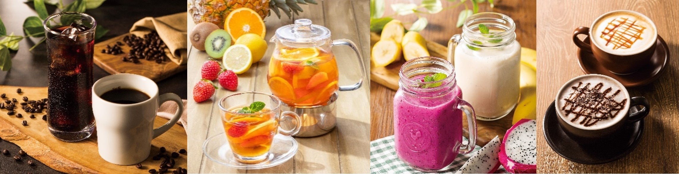 100%オーガニック、レインフォレスト・アライアンス W認証の珈琲豆を使用した「ブレンド珈琲・アメリカン珈琲」や、5種のフルーツとティーを合わせた華やかな香り広がる「HOT!フレッシュフルーツティー」、スムージーやフローズンドリンクなど、多彩なフードやスイーツにもぴったりのバラエティに富んだドリンクメニューをご用意しております。