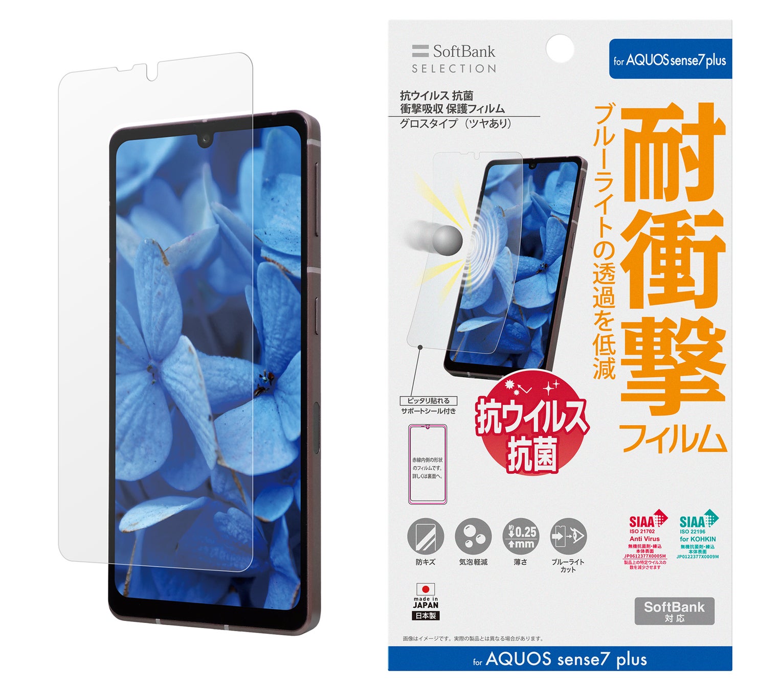 薄さ約 0.25 mm で画面にかかる衝撃を半減させる耐衝撃性能の保護フィルムは、ハードコート処理を施しており、キズがつきにくく衝撃からディスプレイを保護します。さらに、抗ウイルス加工※1や抗菌加工※1を施しており、抗菌製品技術協議会が制定した“SIAAマーク認証”※2も取得しています。また、画面から発せられるブルーライトを約28%カットします。