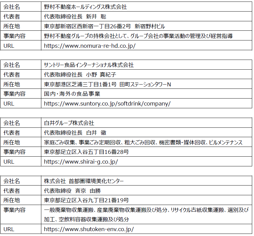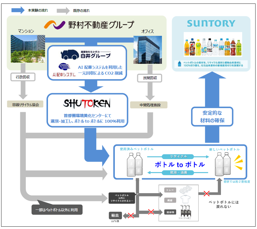 具体的には、野村不動産グループが管理するマンション・オフィスの合計19物件から出る使用済みペットボトルを一括で提供、白井グループがAI配車システムを活用し、19物件を最短ルートで一元回収いたします。その後、首都圏環境美化センターが選別・加工した上で、リサイクル会社を通して、全てが再生ペットボトルの原料としてサントリーグループで活用いたします。
