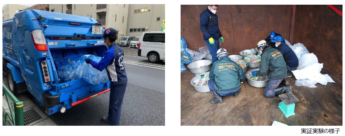 本実験は、本来マンションから廃棄されたペットボトルは主に行政による回収(一般廃棄物)、オフィスビルなどの業務系施設から廃棄されたペットボトルは民間による回収(産業廃棄物)と別々のルートで回収されるものを、一元回収することで運搬時に発生するCO₂の削減、ならびに回収コストの合理化を高める水平リサイクルの展開可能性を検証するものです。