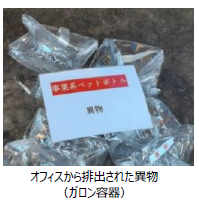 一方で、回収した使用済みペットボトルの品質確認を行ったところ、オフィスで回収したものはマンションから回収したものに比べ、異物などが混入したペットボトルが多い傾向がみられたため、オフィスでの使用済みペットボトルの品質向上に向けて、分別啓発など、業界を越えた取組みが必要であることが分かりました。