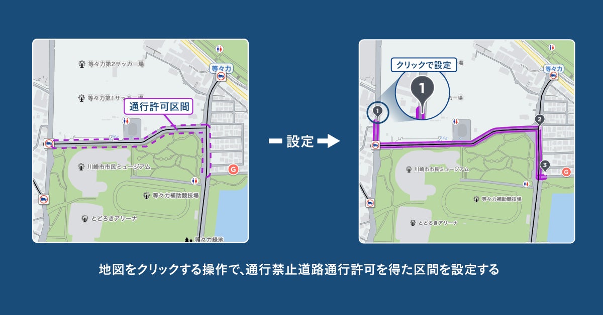 通行許可区間の設定は、地図をクリックすることで簡単にでき、大型貨物自動車等通行止めや車両サイズ等による規制区間を確認しながら操作ができます。