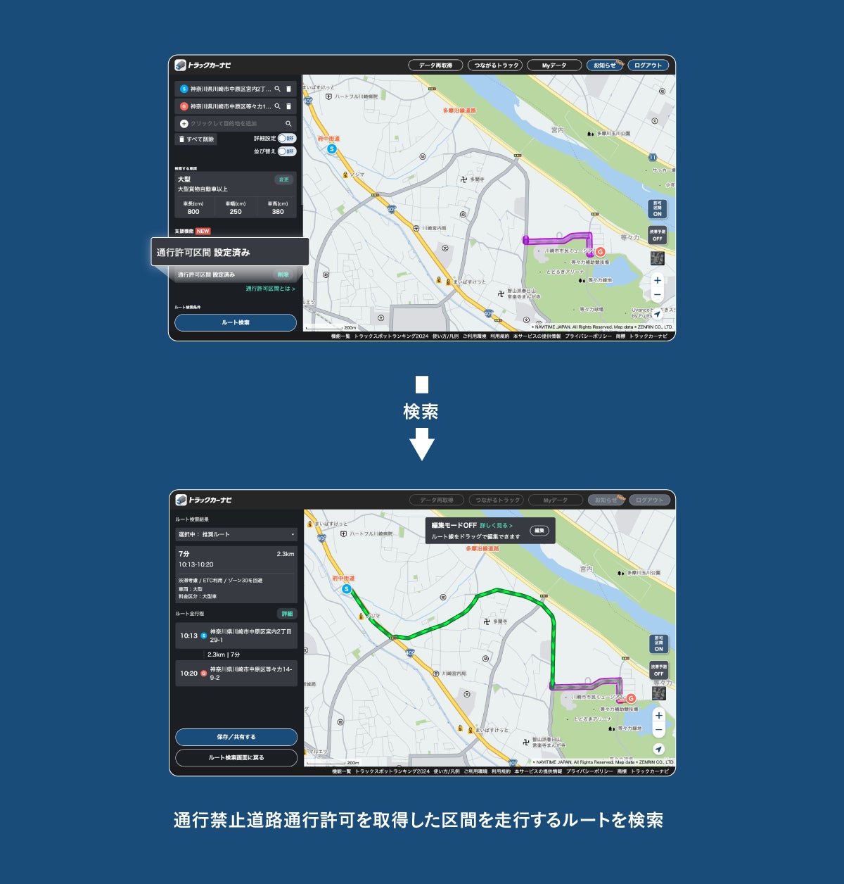 ~Web版『トラックカーナビ』で、通行許可証のある区間を設定し、検索。アプリに共有し、ナビも可能~