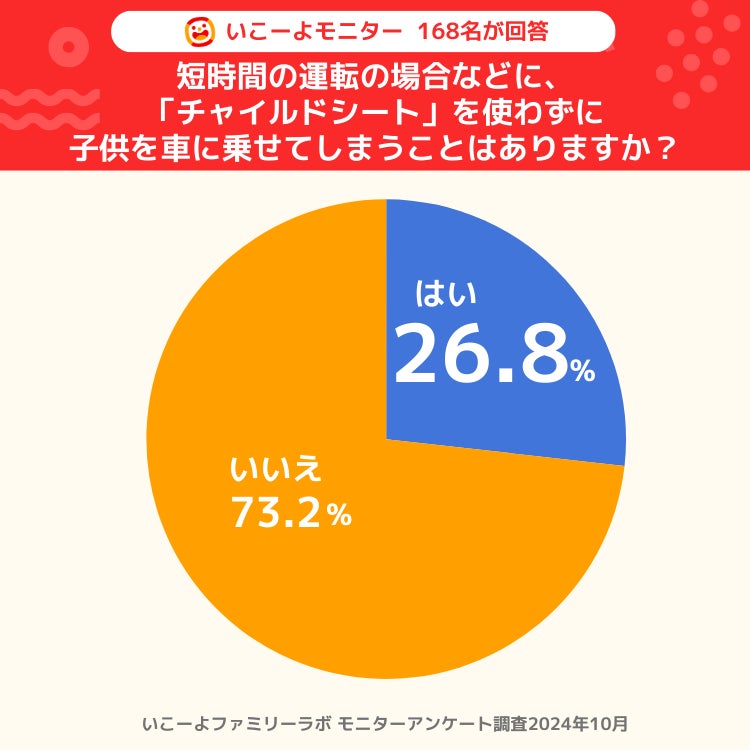 調査では、「短時間の運転の場合などに、チャイルドシート(ジュニアシート)を使わずに子供を車に乗せてしまう(しまった)ことはありますか?」という問いに対して、26.8%のママ・パパが「はい」と回答しました。