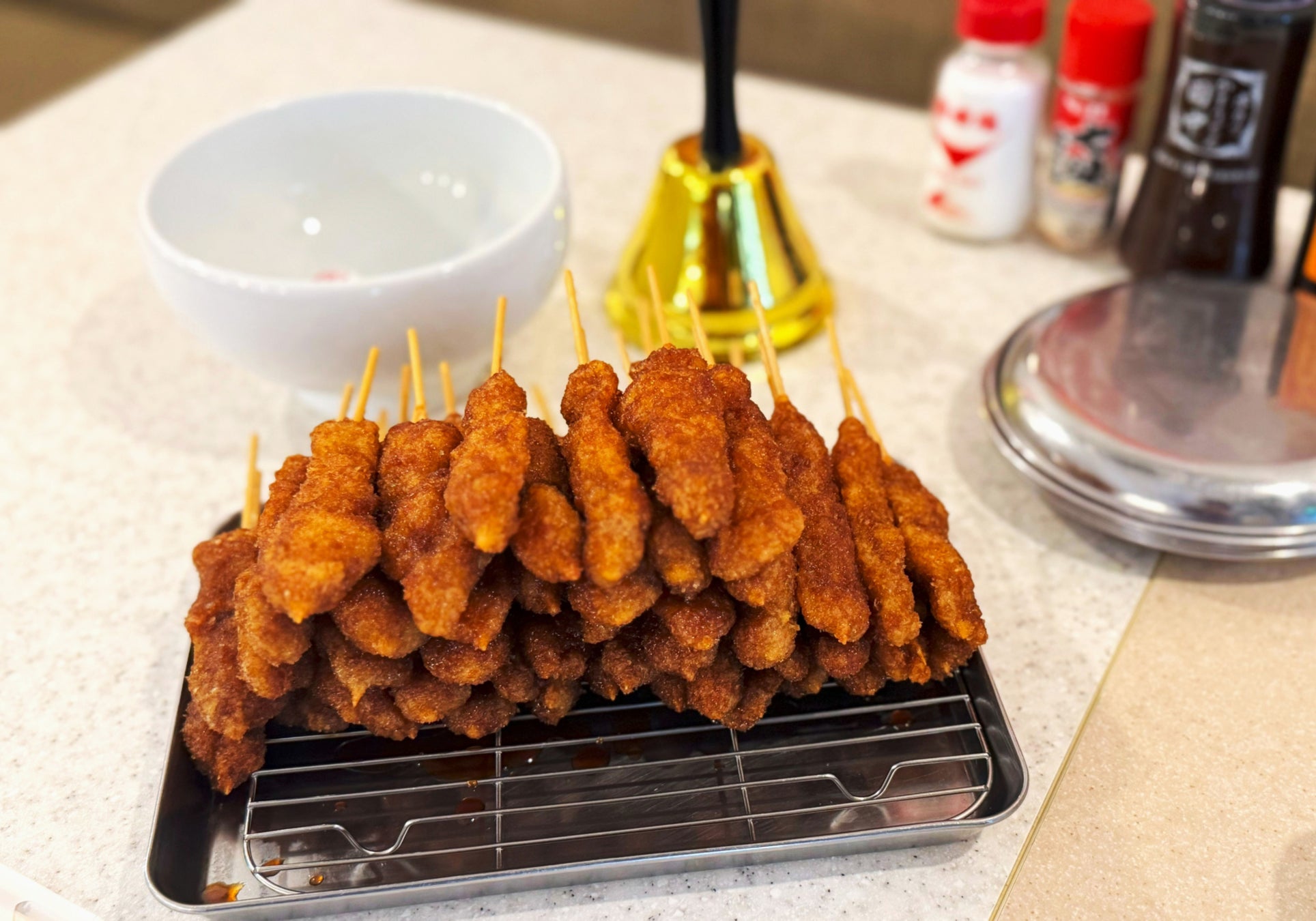 1本50円(税込55円)と頼みやすい価格、そして通常の串カツよりも小ぶりのため軽くて食べやすく、さらにニンニクの味がクセになりお酒に非常に合う味付けです。