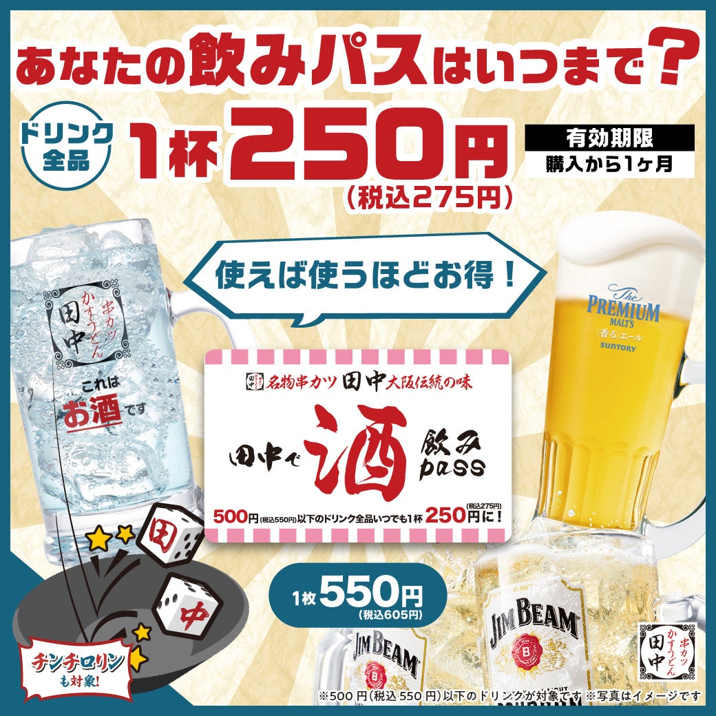 SNS上でも「メチャクチャおいしい!」「お酒と相性が抜群!」「本当に無限に食べられる!」など大変ご好評いただいている串カツ田中の新名物“無限串”は、田中で飲みPass(以下、飲みパス)とチンチロリンドリンク(以下、チンチロ)でさらに楽しく無限に食べられます!