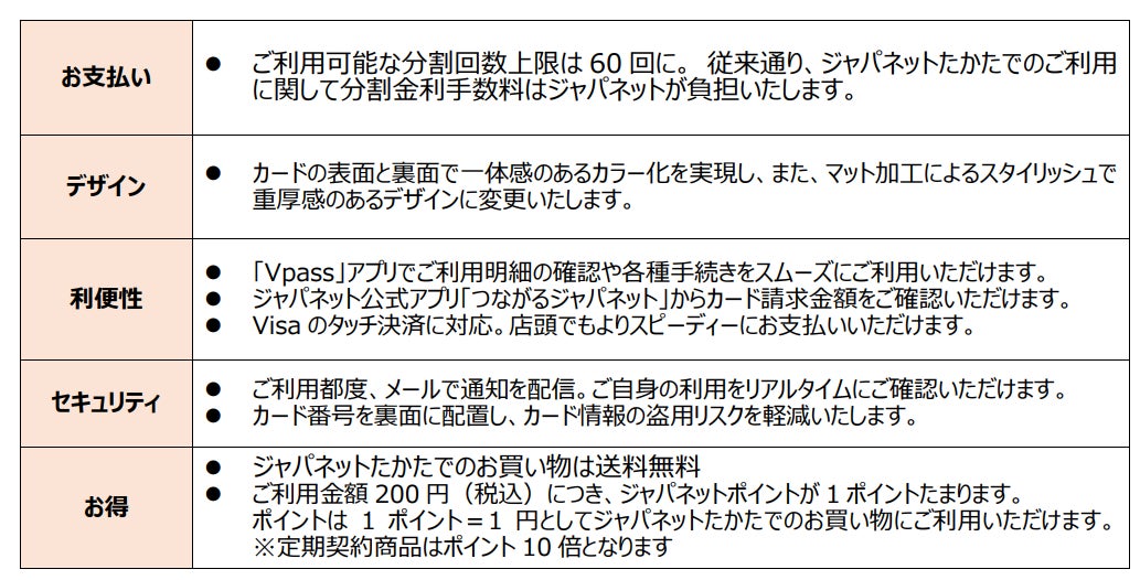 特に、ジャパネットの強みである「分割払い」において、ジャパネットたかたでのお買い物の際、分割金利手数料無料でご利用可能な分割回数を60回まで拡大し、お客様のご負担のさらなる軽減を実現いたしました。また、カードデザインも一新し、「ジャパネットカード」が、お客様にとってより使いやすいカードとなることを目指します。